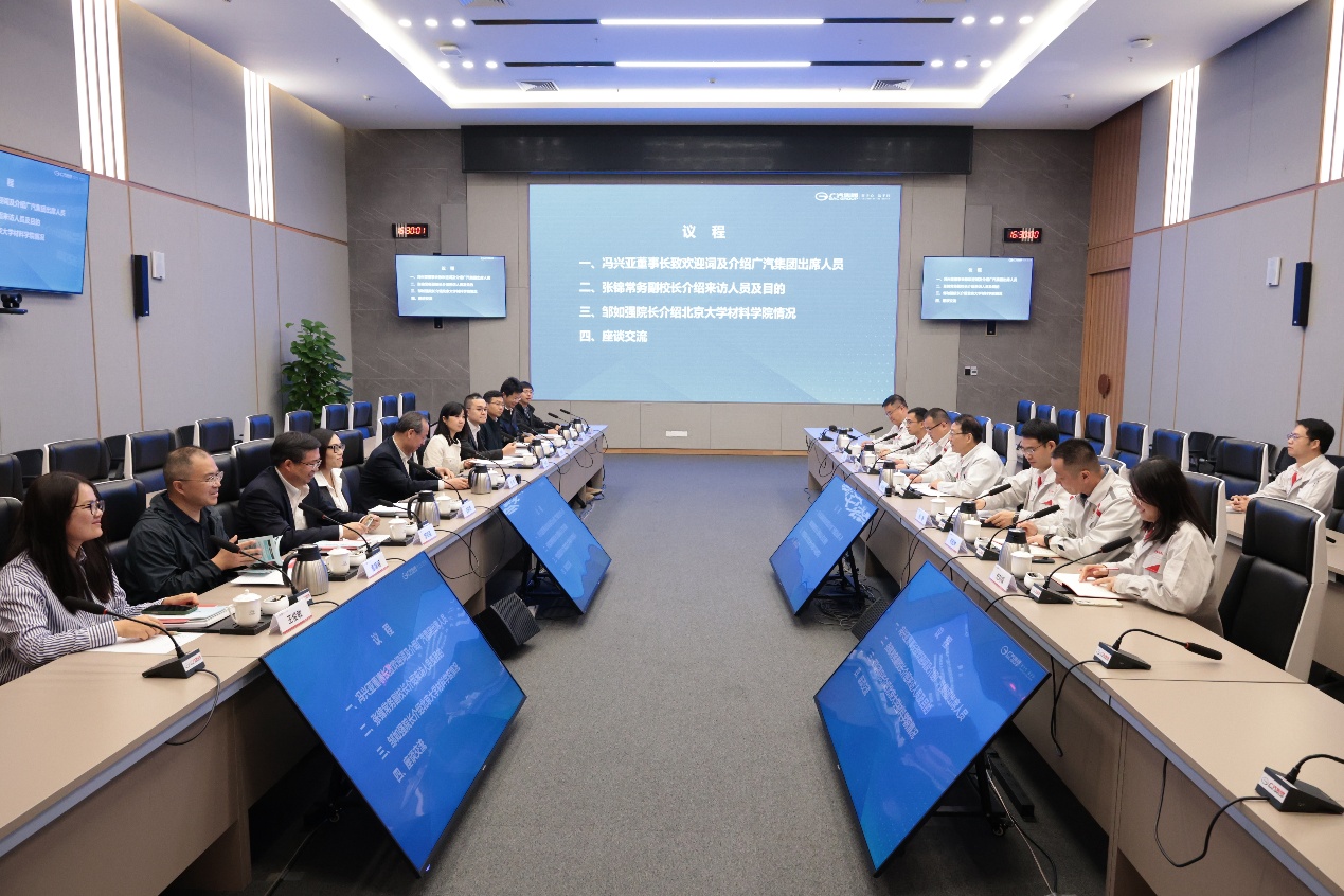 为深入贯彻国家“产教融合、科教融汇”战略部署,推动材料学科与新能源及智能汽车产业的深度对接,提升学校在新材料领域的科研创新能力与人才培养质量,2025年12月15日,北京大学党委常委、常务副校长、中国科学院院士张锦率北京大学代表团赴广汽集团开展校企合作调研。北京大学科研部副部长杨凌春,深圳研究生院科研处处长史莉莉,材料科学与工程学院及深圳研究生院新材料学院院长邹如强,新材料学院副院长肖荫果、童廉明等共同参加调研。广汽集团党委书记、董事长冯兴亚,埃安BU(产品线)总裁张维,平台院院长梁伟强,平台院新能源动力研发中心主任祁宏钟等集团领导出席交流活动。