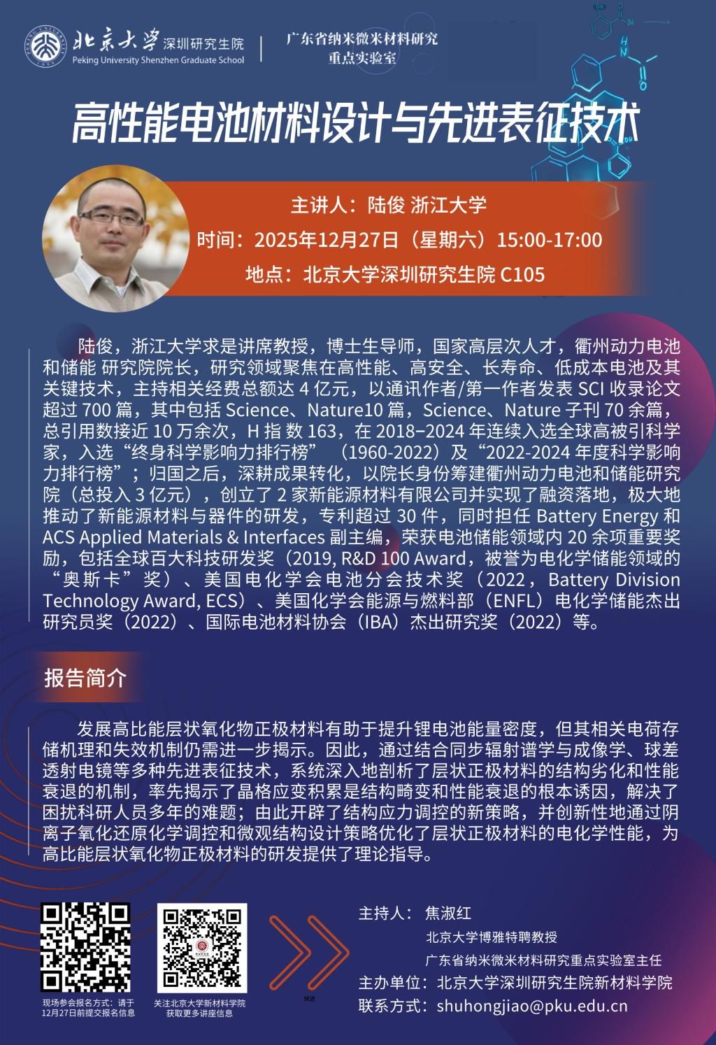 陆俊,浙江大学求是讲席教授,博士生导师,国家高层次人才,衢州动力电池和储能 研究院院长,研究领域聚焦在高性能、高安全、长寿命、低成本电池及其关键技术,主持相关经费总额达 4 亿元,以通讯作者/第一作者发表 SCI 收录论文超过 700 篇,其中包括Science、Nature10 篇,Science、Nature 子刊 70 余篇,总引用数接近 10 万余次,H 指 数 163,在 2018−2024 年连续入选全球高被引科学家,入选“终身科学影响力排行榜” (1960-2022)及“2022-2024 年度科学影响力排行榜”;归国之后,深耕成果转化,以院长身份筹建衢州动力电池和储能研究院(总投入 3 亿元),创立了 2 家新能源材料有限公司并实现了融资落地,极大地推动了新能源材料与器件的研发,专利超过 30 件,同时担任 Battery Energy 和 ACS Applied Materials & Interfaces 副主编,荣获电池储能领域内 20 余项重要奖励,包括全球百大科技研发奖(2019, R&D 100 Award,被誉为电化学储能领域“奥斯卡”奖)、美国电化学会电池分会技术奖(2022,Battery Division Technology Award, ECS)、美国化学会能源与燃料部(ENFL)电化学储能杰出研究员奖(2022)、国际电池材料协会(IBA)杰出研究奖(2022)等。