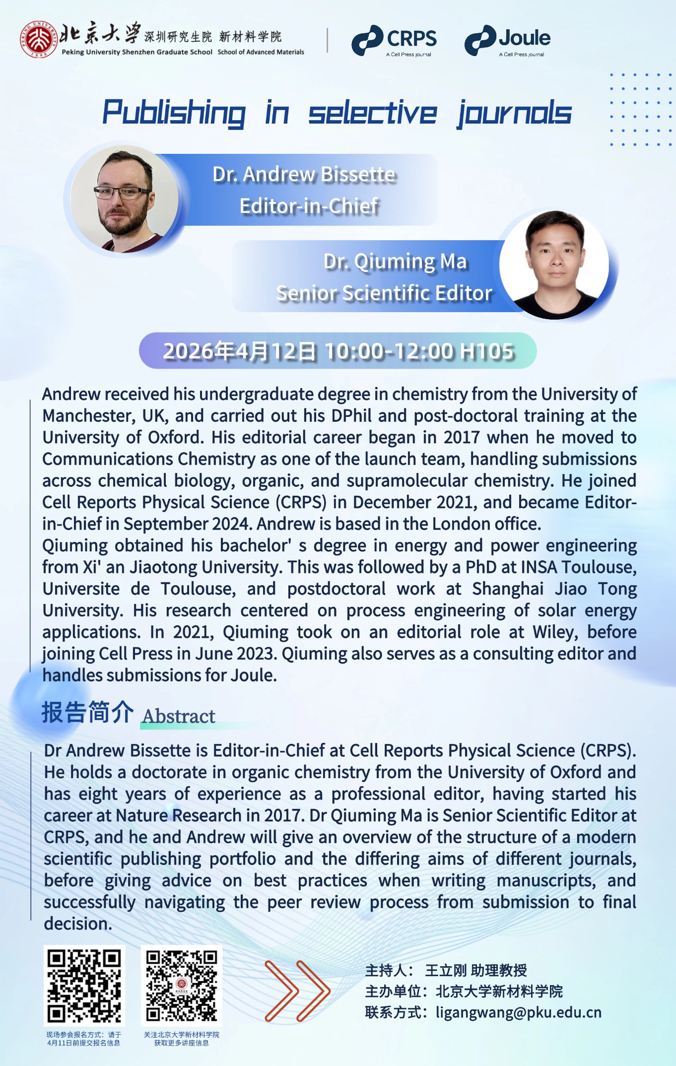 Dr Andrew Bissette is Editor-in-Chief at Cell Reports Physical Science (CRPS). He holds a doctorate in organic chemistry from the University of Oxford and has eight years of experience as a professional editor, having started his career at Nature Research in 2017. Dr Qiuming Ma is Senior Scientific Editor at CRPS, and he and Andrew will give an overview of the structure of a modern scientific publishing portfolio and the differing aims of different journals, before giving advice on best practices when writing manuscripts, and successfully navigating the peer review process from submission to final decision.