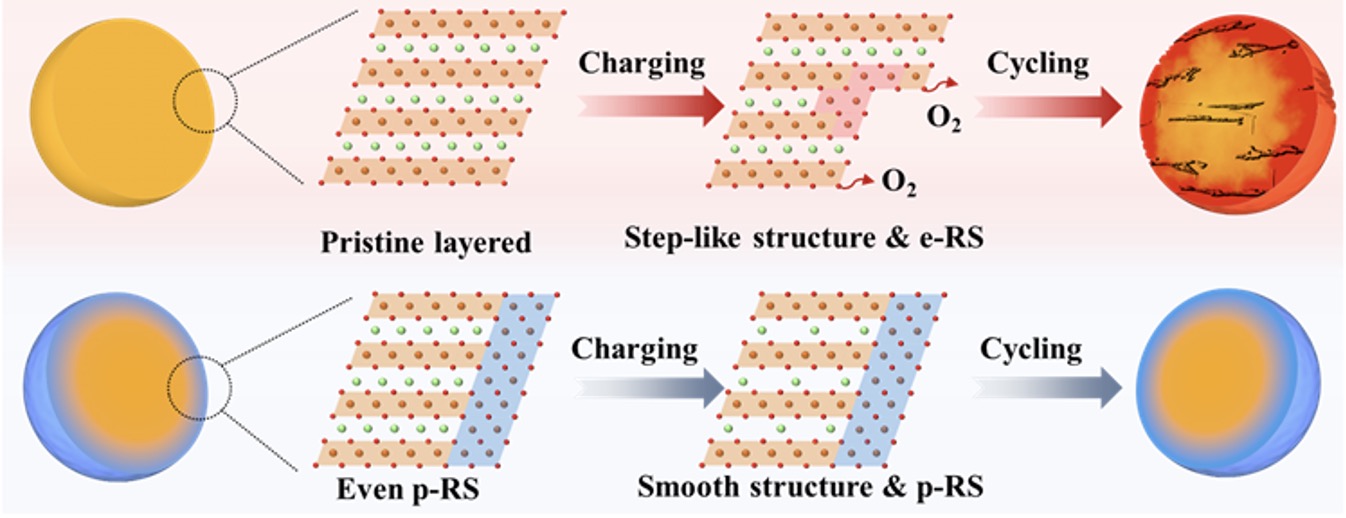 进一步研究表明,高电压循环过程中LCO表面原位形成的岩盐相(e-RS)呈现分布不连续、厚度不均一的特征,且常与纳米台阶相伴出现。这种e-RS相不仅难以遏制Co-O层的持续位移及其诱导的纳米台阶形成,反而会在长循环过程中逐渐增厚,最终演化为严重阻碍Li⁺迁移动力学的超厚表面电化学钝化层。基于上述微观机制,团队提出了一种表面工程策略:在LCO表面预构筑致密、连续的岩盐相保护层(p-RS),以稳定表层晶格结构,从根源上抑制Co-O层位移与表面纳米台阶生成,从而减缓表面晶格氧流失及后续结构劣化。电化学性能验证表明,经p-RS改性的RS-LCO在3.0–4.6 V电压区间、1C倍率下循环100圈后,容量保持率高达88.6%,较之未经处理的商业化LCO(仅47.6%)实现了跨越式提升。