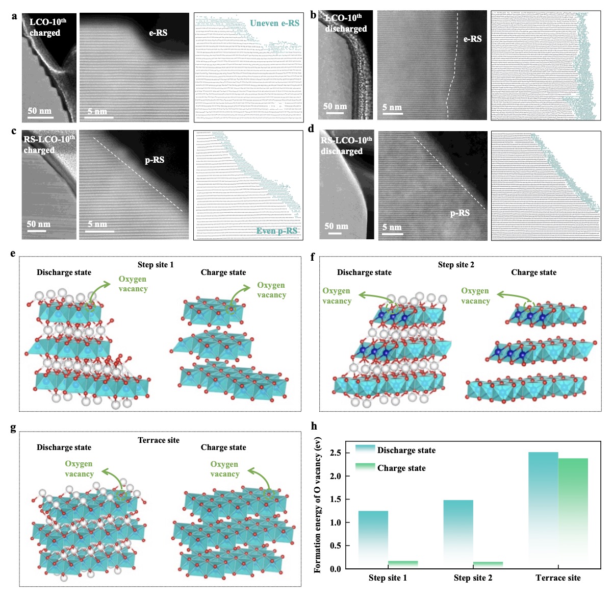 图1. 表面结构和理论计算。(a)充电态和(b)放电态LCO,以及(c)充电态和(d)放电态RS-LCO在第10个循环中的HAADF-STEM图像和AI分割的表面结构;(e)(104)晶面、(f)(003)晶面和(g)平台位点在充电态和放电态下OV形成的示意图。(h)三个表面位点的OV形成能计算。