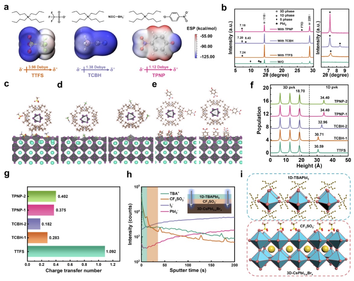 近日,我院杨世和教授团队与信息工程学院周航长聘副教授团队合作,在国际著名期刊《Nature Communications》上发表题为“Self-assembled 1D/3D heterojunction enables all-inorganic perovskite 4-terminal tandem solar cells with 21.54% certified efficiency”(自组装1D/3D异质结实现21.54%认证效率的全无机钙钛矿四端叠层太阳能电池)的研究论文。该工作设计了一种双功能两性离子盐——三氟甲磺酸四丁基铵(TTFS),在全...