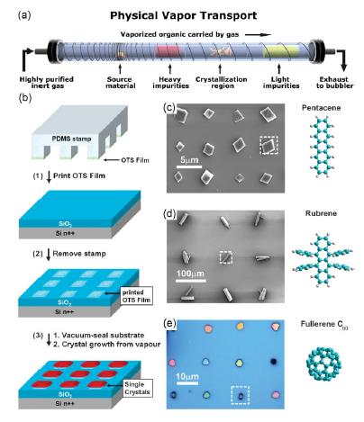 1) 图1展示了如何通过物理气相传输法获得有机单晶并利用这些单晶制备TFT的方法。虽然气相法生长较小尺寸的有机单晶体过程简单,但是如何获得适用于TFT的有机单晶薄膜还是一个挑战。因而,世界上很少有实验室制备出基于有机单晶薄膜的性能优异的TFT。此外,通过比较有机单晶和多晶的霍尔系数测量结果,还能对有机半导体材料的导电机理有更深入的理解。